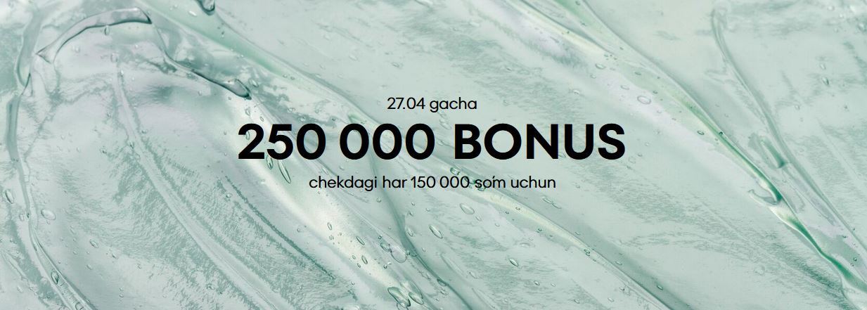 Yanada quvonchli xaridlar! 10-fevraldan 27-aprelgacha chekdagi har 150 000 soʻm uchun 250 000 bonus hisoblaymiz. Yangi kolleksiya va mavsumning eng oldi modellari sizni kutmoqda!